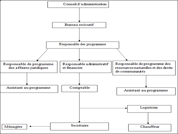 L’organisation comprend trois (3) départements : le département juridique, le département de ressources naturelles et le département administratif et financier (figure 2). Ces départements sont animés par un (1) personnel permanent, temporaire et bénévole.